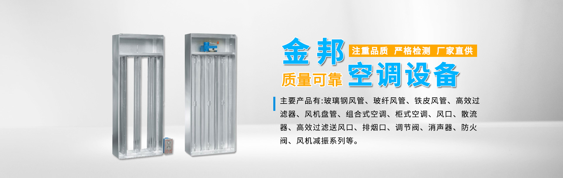 江蘇金邦空調(diào)設(shè)備制造有限公司專業(yè)生產(chǎn)玻璃鋼風(fēng)管、玻纖風(fēng)管、鐵皮風(fēng)管、高效過(guò)濾器、風(fēng)機(jī)盤管、組合式空調(diào)、柜式空調(diào)、風(fēng)口、散流器、高效過(guò)濾送風(fēng)口、排煙口、調(diào)節(jié)閥、消聲器、防火閥、風(fēng)機(jī)減振系列等產(chǎn)品